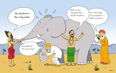 “One of the men finds the elephant’s leg and describes it as being round and rough like a tree. Another feels the tusk and describes the elephant as a spear. A third grabs the tail and insists that an elephant is like a rope. A fourth discovers the trunk and insists that the elephant is like a large snake.